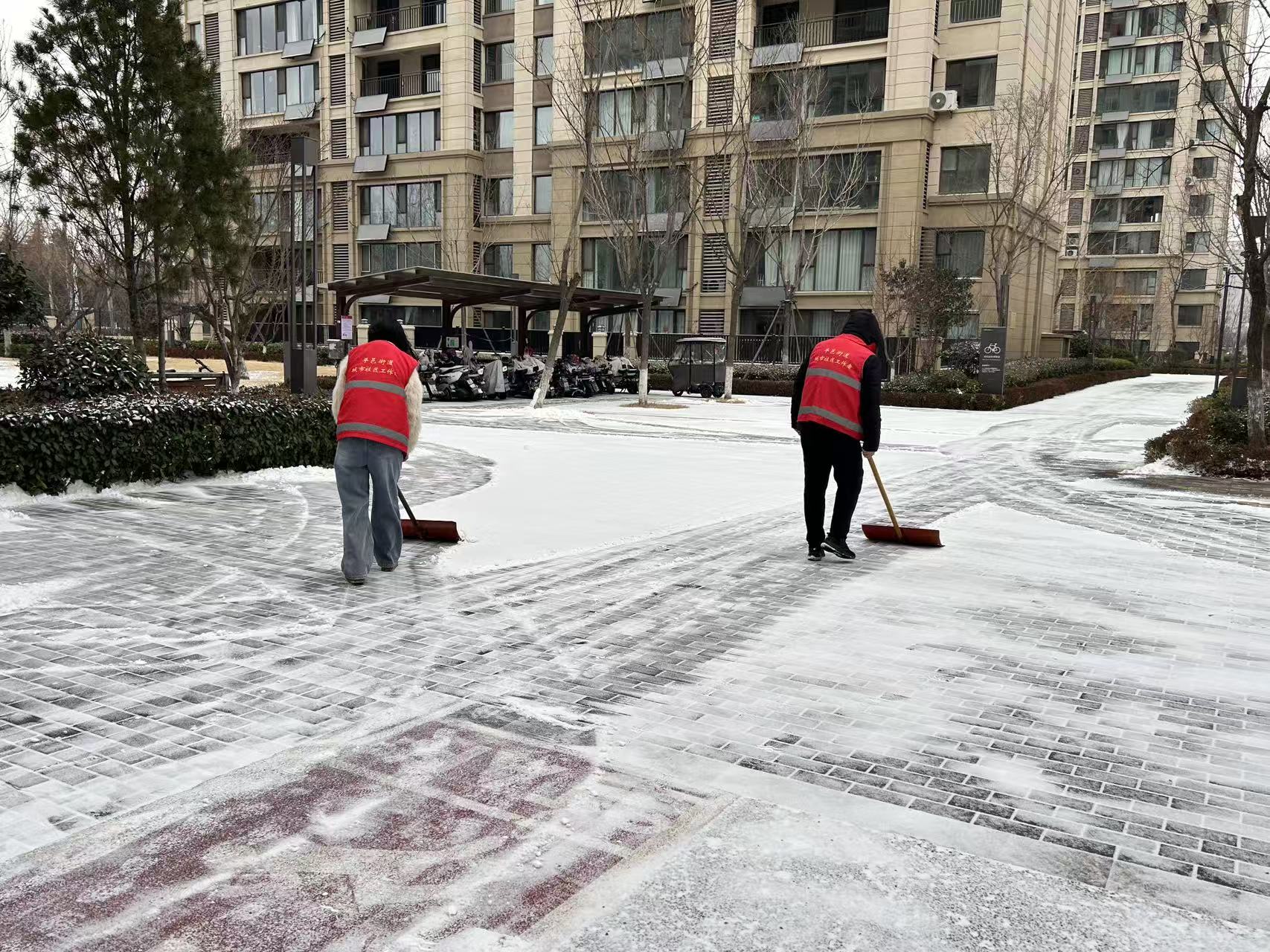 寒潮带来的降雪已经停歇,但是社区的主次干道以及居民楼出入口残留着大量积雪。受低温影响,部分路面凝结成冰,给居民出行带来安全隐患。为保障居民出行安全,祥云社区开展扫冰除雪活动。