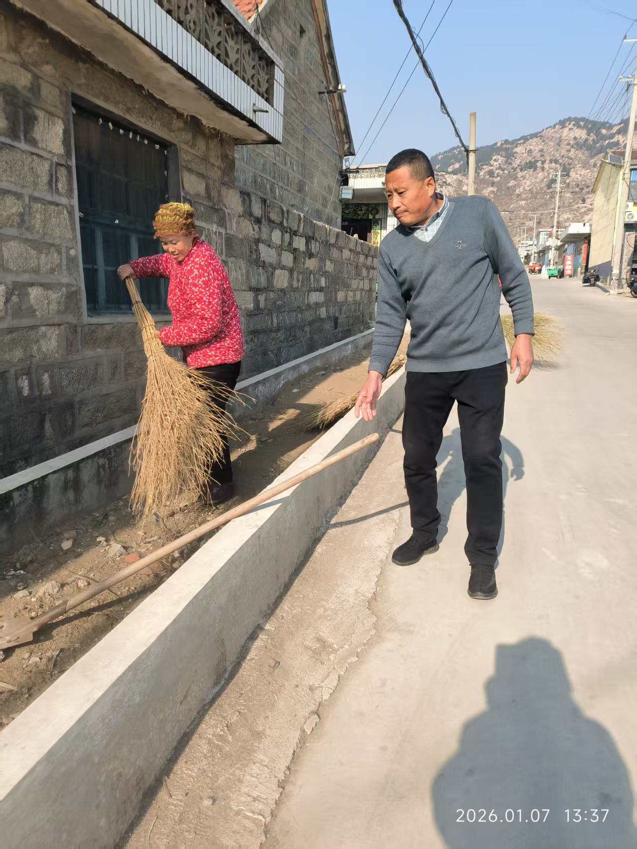 小楼村人居环境整治志愿活动,要求志愿者穿好红色马甲,拿着镰刀扫帚等工具清理杂草和垃圾,并把杂草和垃圾放到指定位置。