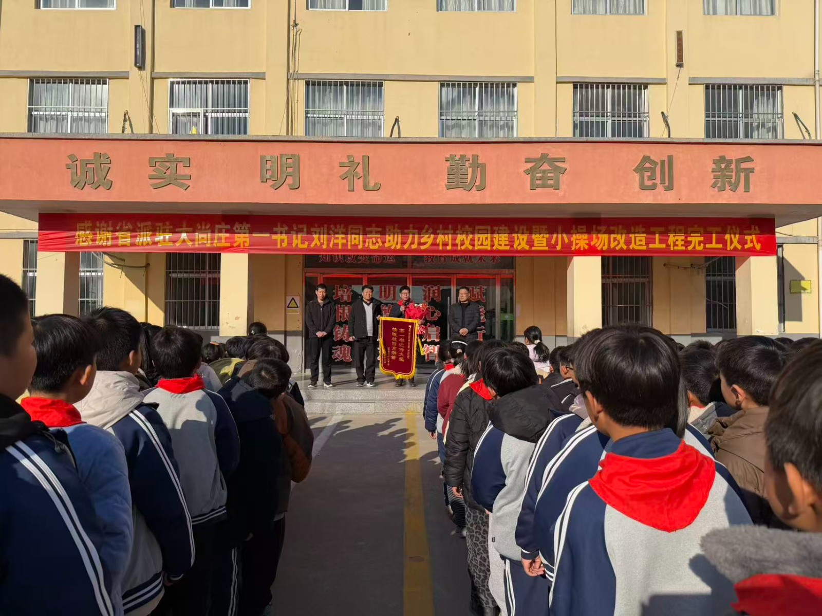 冬日暖阳照校园,崭新操场焕新颜。2026年1月8日,大尚庄乡村校园内彩旗飘扬、掌声阵阵,省派驻大尚庄第一书记刘洋同志助力乡村校园建设暨小操场改造工程完工仪式隆重